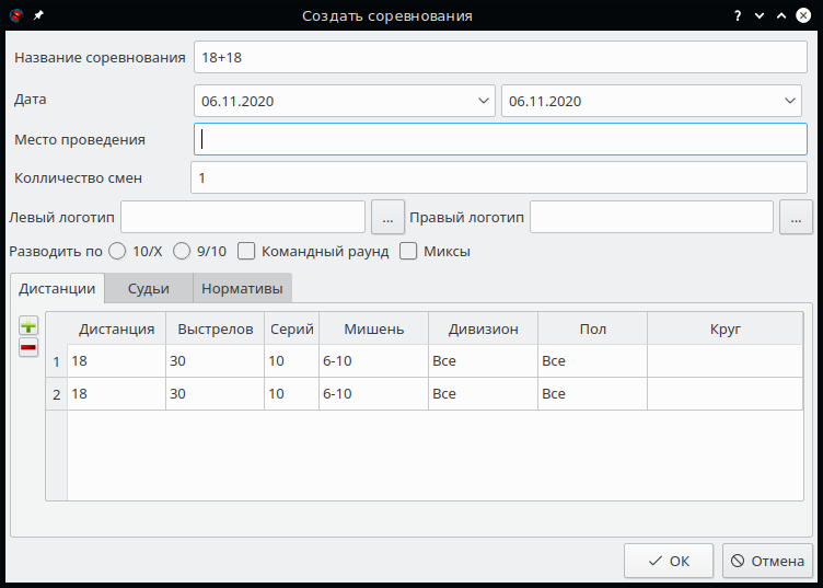 Также, если необходимо, заполнить судей соревнований, добавить дистанции и выбрать варианты финалов и нормативы для каждого из дивизионов.
