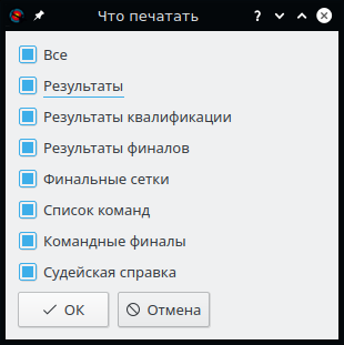 - Печатать результаты, карточки участников, сетки и различные отчёты