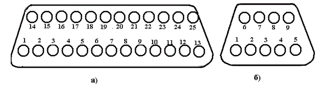 В компьютере интерфейс RS-232C реализован в двух исполнениях – 9-ти контактном и 25 – контактном (рис.3.1а и рис.3.1б, соответственно).