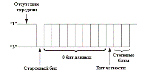Формат передаваемых данных показан на рисунке 3.3. Собственно данные (5, 6, 7 или 8 бит) сопровождаются стартовым битом, битом четности и одним или двумя стоповыми битами. Получив стартовый бит, приемник выбирает из линии биты данных через определенные интервалы времени. Очень важно, чтобы тактовые частоты приемника и передатчика были одинаковыми (допустимое расхождение - не более 10%). Скорость передачи по RS-232C может выбираться из ряда: 110, 150, 300, 600, 1200, 2400, 4800, 9600, 19200, 38400, 57600, 115200 бит/с.