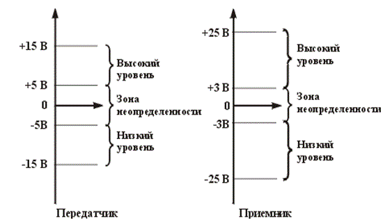 Рис.3.4 Уровни сигналов RS-232C на передающем и принимающем концах линии связи.