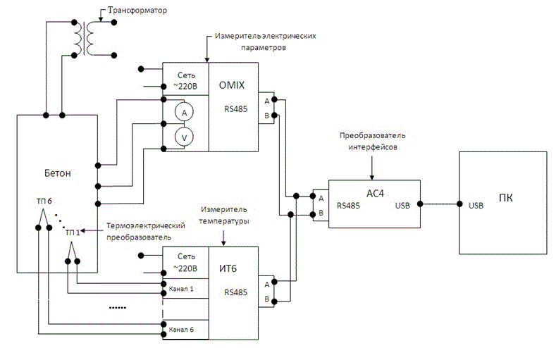 Современные пользовательские ЭВМ в отличие от промышленных ЭВМ не комплектуются разъемами COM-порта. Поэтому при применении таких ЭВМ в промышленных сетях сбора и управления используется USB-интерфейс. Программирование USB-интерфейса выполняется такими же процедурами как в интерфейсах RS-232C, RS-485 и RS-422. Для перехода от USB-интерфейса к интерфейсам RS-485 и RS-422 используется специальный адаптер – преобразователь интерфейсов AC4 предназначенный для взаимного преобразования сигналов интерфейсов USB и RS485. АС4 позволяет подключать к промышленной информационной сети на базе RS485 персональный компьютер, имеющий USB-порт. Структура такой сети на примере съема значений температуры бетона и управления нагревом бетона при зимнем бетонировании показана на рис.3.5.