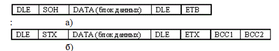 Запрос на обмен осуществляется посылкой последовательности DLE SOH. Получив положительную квитанцию DLE ACK, передающая сторона начинает передачу кадров. Сначала передается управляющий кадр, имеющий формат, показанный на рис.3.6а, затем после приема положительной квитанции DLE ACK передается кадр данных (рис.3.6б).