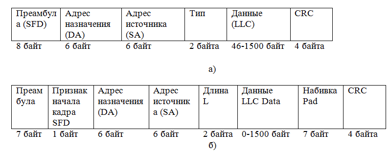 Стандарт IEEE 802.3 был разработан на основе кадра Ethernet, изменив ряд его характеристик. Стандарт IEEE 802.3 во многом совпадает со своим предшественником, но некоторые различия все же имеются. В частности, в стандарте IEEE 802.3 различаются уровни MAC и LLC. В оригинальном Ethernet оба эти уровня объединены в единый канальный уровень. Согласно стандарту IEEE 802, кадр технологии Ethernet – это кадр, формируемый уровнем MAC, в который должен вкладываться кадр уровня LLC. Форматы базового кадра Ethernet и пакета стандарта IEEE 802.3 показаны на рисунке 3.9а и 3.9а, соответственно: