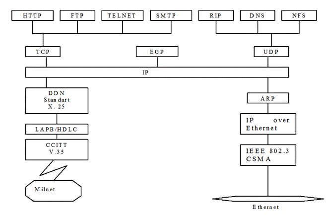 По рисунку видим сложность и иерархию протоколов в обычной рабочей машине сети. Конечно, не все из показанных протоколов находятся в машине.