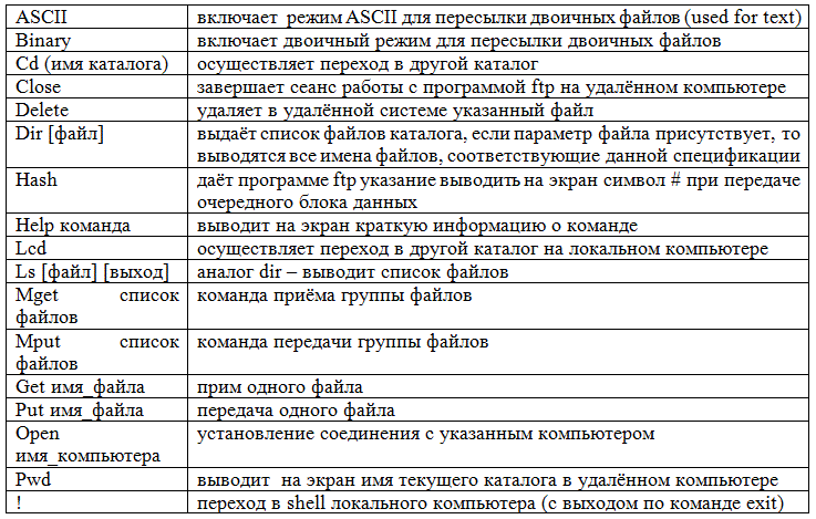 В большинстве реализаций ftp имеет 70-80 команд, естественно, что приведённый список является сокращённым.
