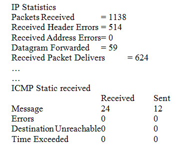 Команда netstat –s выдаёт содержимое счётчиков, разбросанных по сетевым программам. В выходной информации есть разделы, относящиеся к различным протоколам: IP, ICMP, TCP и UDP. Например, выделить статистическую информацию о конкретном протоколе. Вы можете с помощью опции –s –p <имя протокола>.
