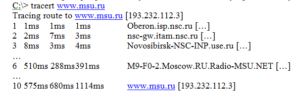 Имя машины может быть задано в символьной или числовой форме. Выходная информация – простой список машин, начиная с первого шлюза и кончая пунктом назначения. Например, проследим путь до Московского государственного университета: