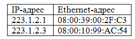 Преобразование адресов выполняется путем поиска в таблице. Эта таблица, называемая ARP-таблицей, хранится в памяти и содержит строки для каждого узла сети. В двух столбцах содержатся IP- и Ethernet-адреса.Если требуется преобразовать IP-адрес в Ethernet-адрес, то ищется запись с соответствующим IP-адресом. Ниже приведен пример упрощенной ARP-таблицы.